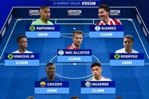 中场:凯塞多(9000万欧)、巴尔韦德(1.3亿欧)、麦卡利斯特(1亿欧)