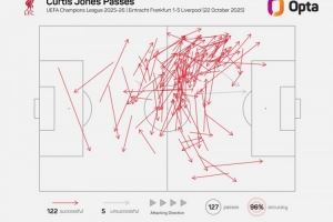 体育资讯10月23日讯 欧冠联赛阶段第三轮比赛,利物浦客场5-1击败法兰克福。此役柯蒂斯-琼斯为利物浦踢满全场,成功传球122次,这是2003-2004赛季Opta统计相关数据以来,利物浦球员欧冠单场成功传球纪录。